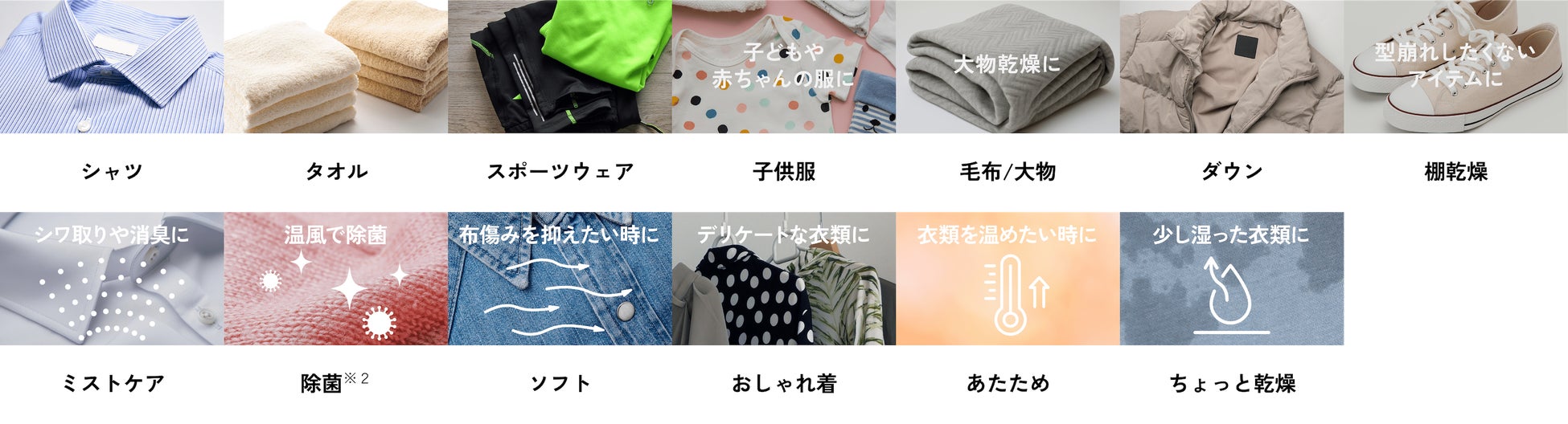 超音波ミストデバイスの搭載によって実現した「ミストケアコース」では、超音波ミストデバイスで発生させたミストで衣類の繊維に水分を浸透させ、「シワのばし」「ふんわり仕上げ」「消臭」※2を可能にします。また温風で除菌する「除菌コース」※3や、タオルをふんわり仕上げる「タオルコース」、型崩れが心配な靴やぬいぐるみを回転させずに乾燥させる「棚乾燥コース」など、生活や衣類に合わせてえらべる全16コースを搭載しております。