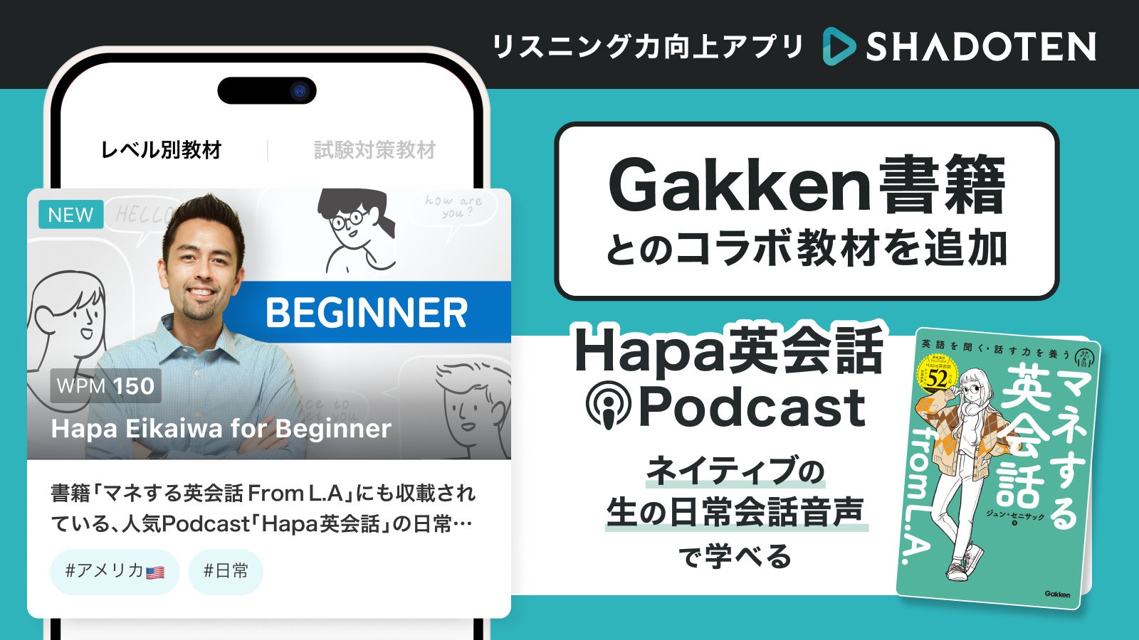 リスニング力向上アプリ「シャドテン」、Gakken書籍コラボで、Hapa英会話Podcast音声を教材追加