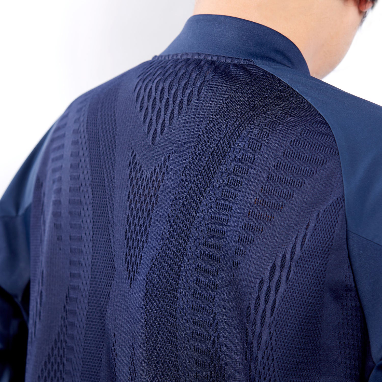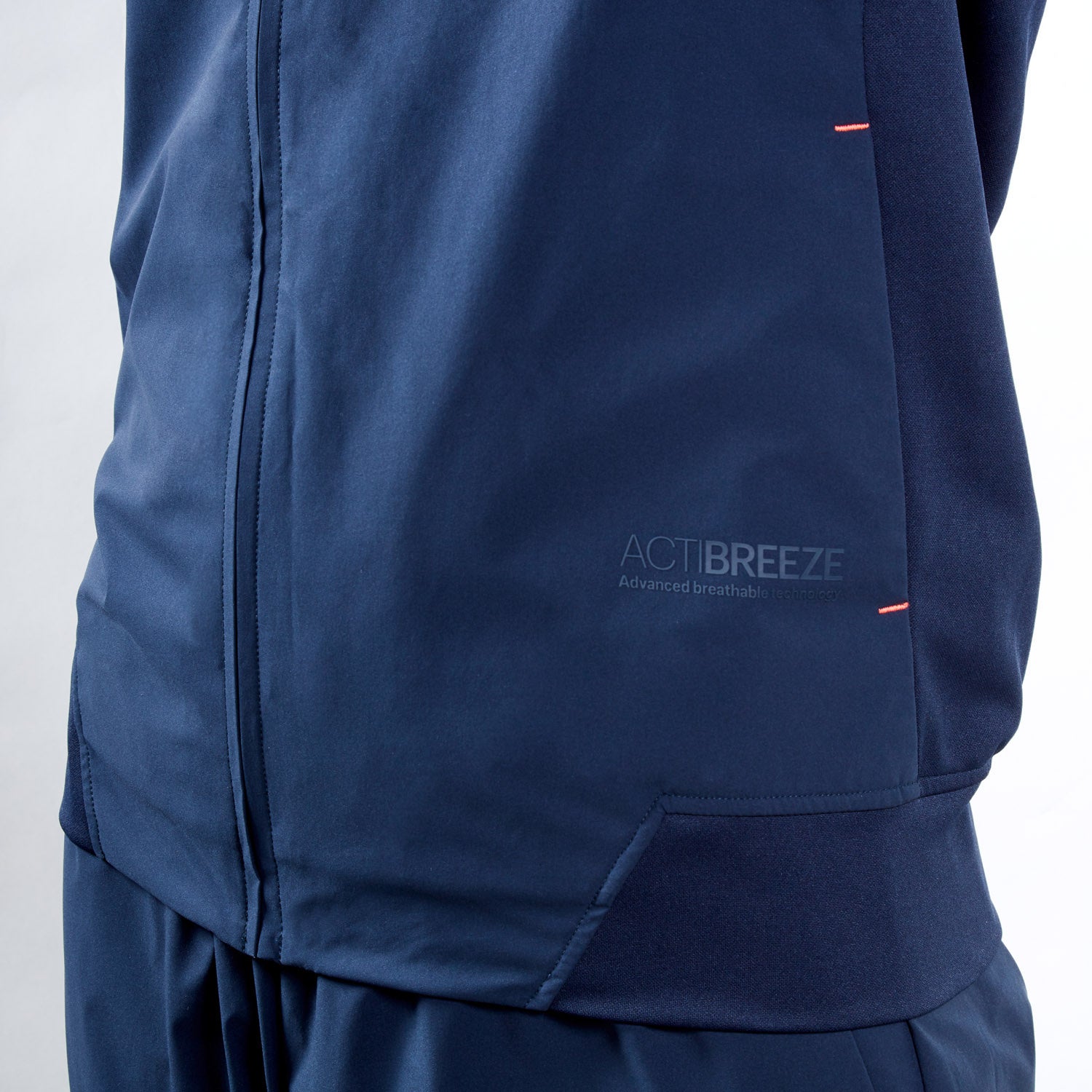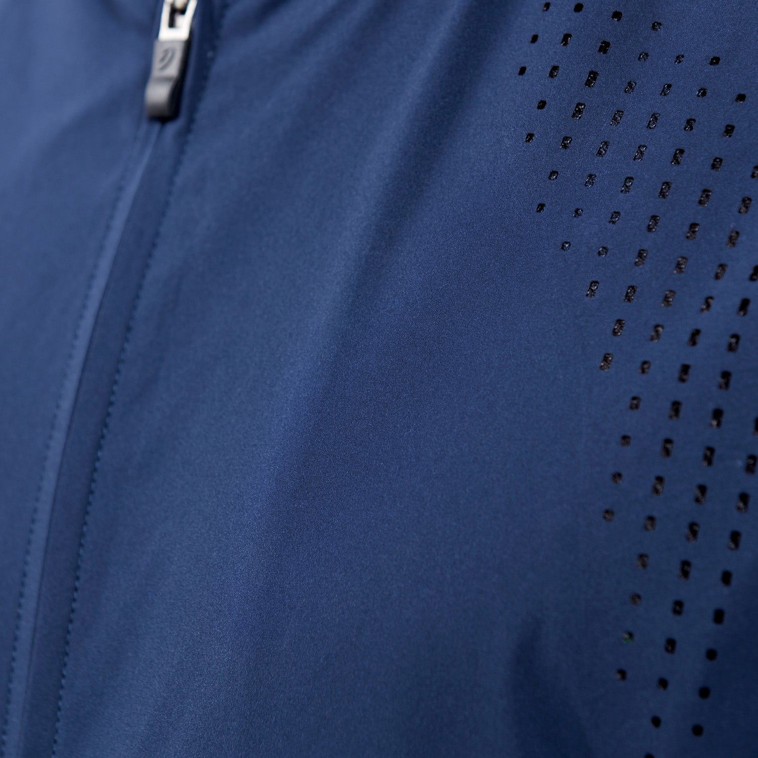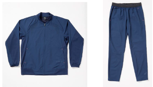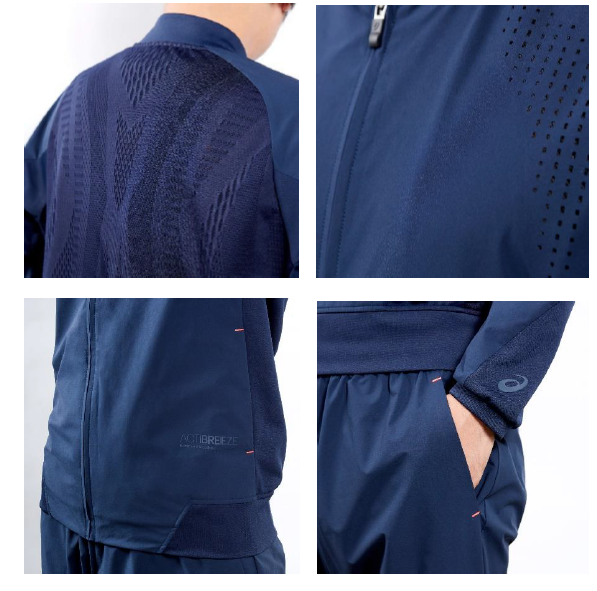 ジャケットは、アシックス独自の機能構造により衣服内を快適に保つ「ACTIBREEZE(アクティブリーズ)」を搭載しています。アシックススポーツ工学研究所で立証された「アシックスボディサーモマッピング」に基づき、体温が上昇しやすい場所を特定し、湿度を効果的に下げるようにしたのが特徴です。汗の量が多くなり、衣服内温度が高くなる場所に粗いメッシュを配置することで空気の流れを促進させ、効率的な通気を促します。