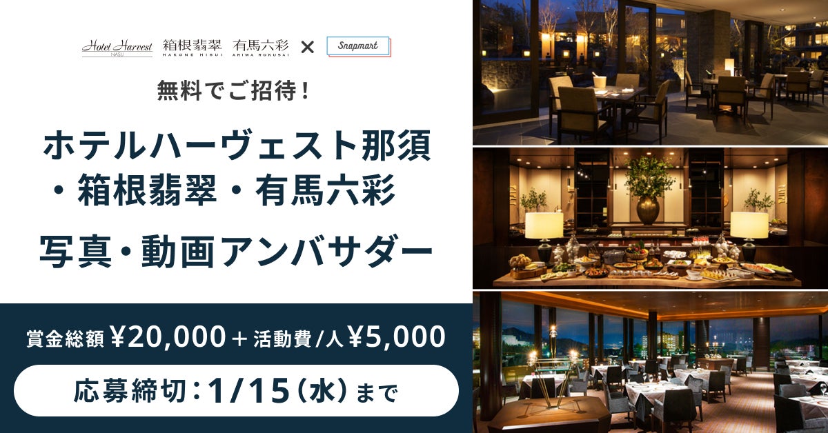 クリエイターとの共創を通じて企業のマーケティング課題を解決する、株式会社CREAVE(本社:東京都千代田区、代表取締役社長:中村真奈、以下 CREAVE)は、東急リゾーツ&ステイ株式会社(本社:東京都渋谷区、代表取締役社長:粟辻󠄀 稔泰、以下、東急リゾーツ&ステイ)が運営する「ホテルハーヴェスト那須」・「箱根翡翠」・「有馬六彩」のアンバサダーを1月7日(火)から募集します。