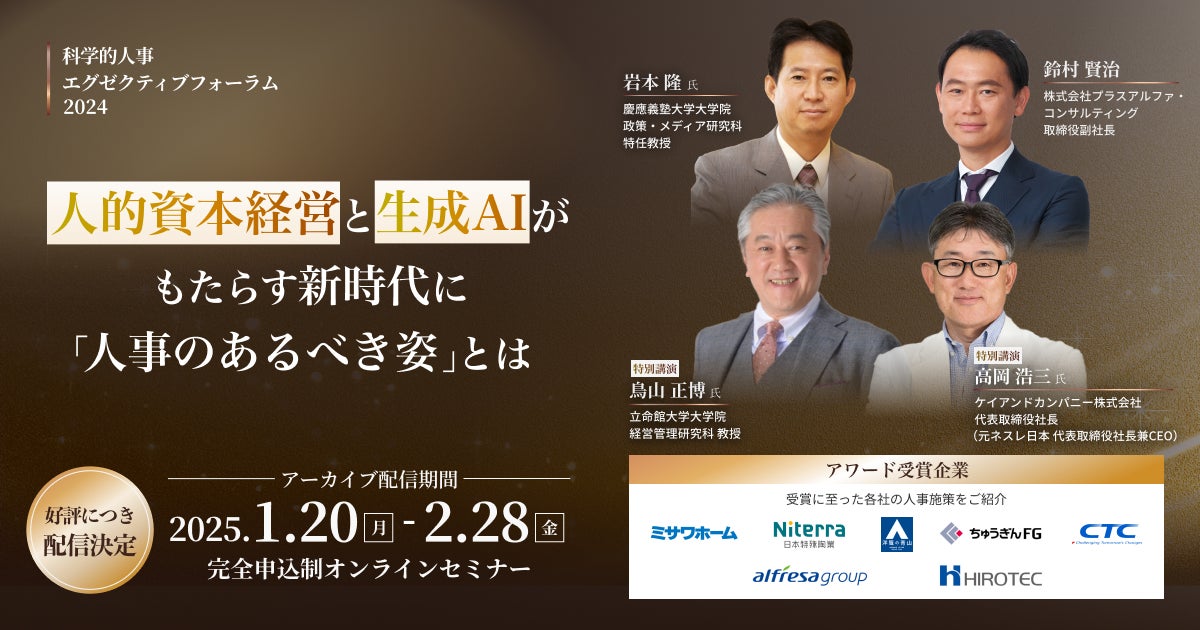 また、「科学的人事 エグゼクティブフォーラム2024」では、本アワードの発表に加え、ケイアンドカンパニー株式会社 代表取締役社長 高岡氏や立命館大学大学院 経営管理研究科 教授 鳥山氏の特別講演などを実施いたしました。2025年1月20日~2月28日にアーカイブ配信をいたしますので、ぜひご覧ください。