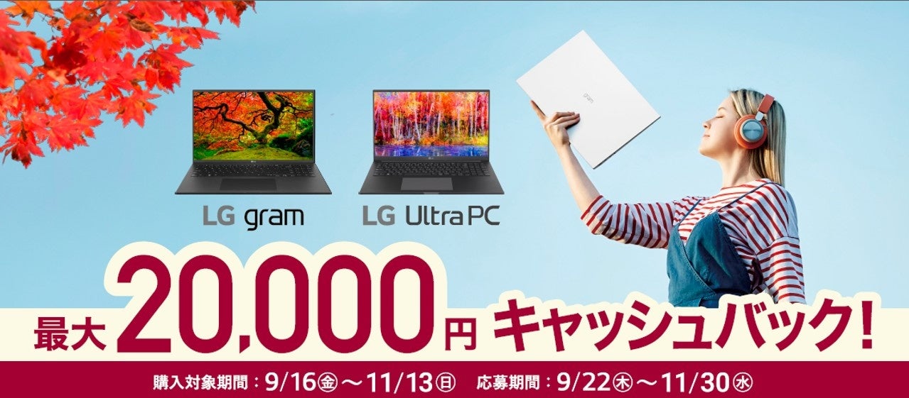 LGエレクトロニクス・ジャパン株式会社(代表取締役:孫 成周(ソン・ソンジュウ)本社:東京都 中央区)は、本日2022年9月16日(金)より、モバイルノートパソコン「LG gram」もしくは「LG UltraPC」の2022年最新モデルをご購入いただいた方を対象とした、『秋のキャッシュバックキャンペーン』を実施します。