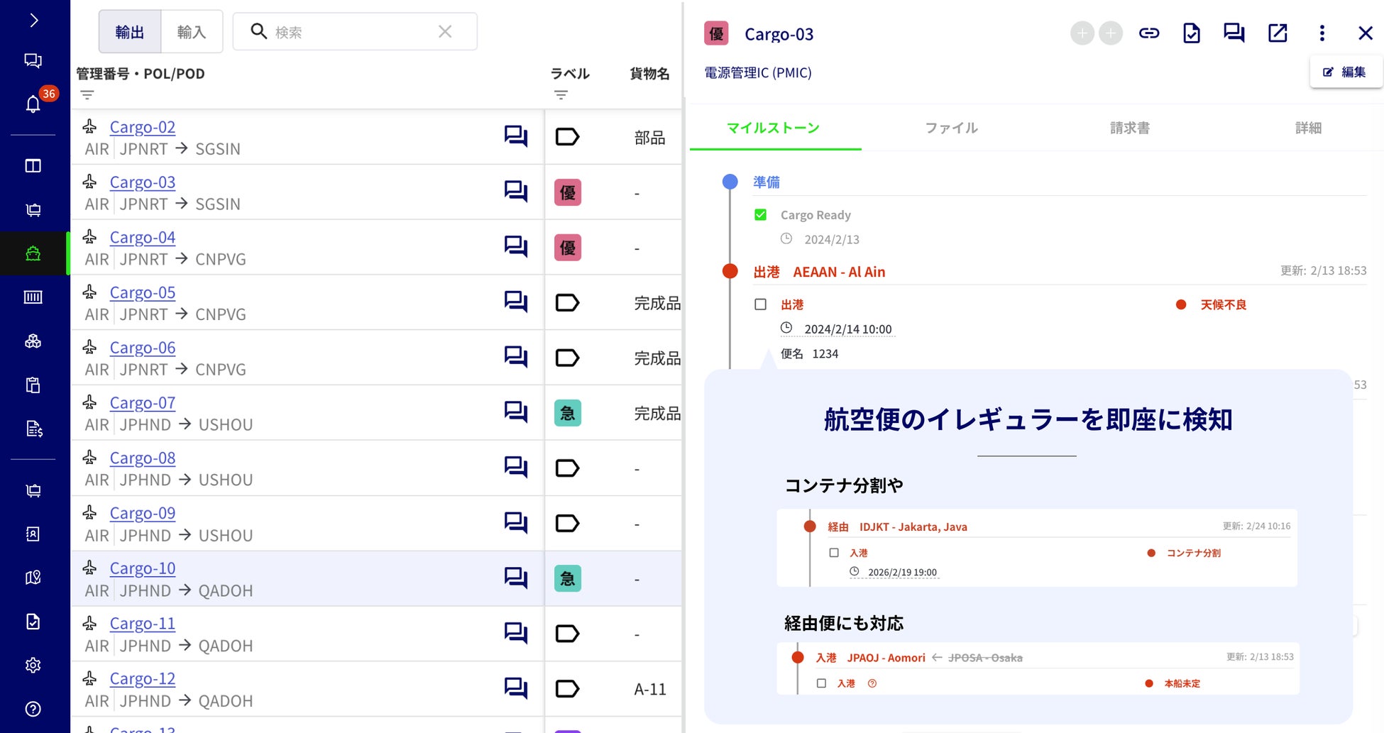 貿易DXを推進する株式会社Shippio(本社:東京都港区、代表取締役CEO:佐藤 孝徳、以下Shippio)は、提供する貿易管理プラットフォームにおいて航空貨物の動静(遅延・欠航の状況)を自動で追跡する「航空貨物自動トラッキング機能」を新たに提供開始いたしました。Shippioは2024年11月に航空貨物運送の免許を取得しており、本機能拡張により航空貨物においても管理カバー範囲を広げてまいります。