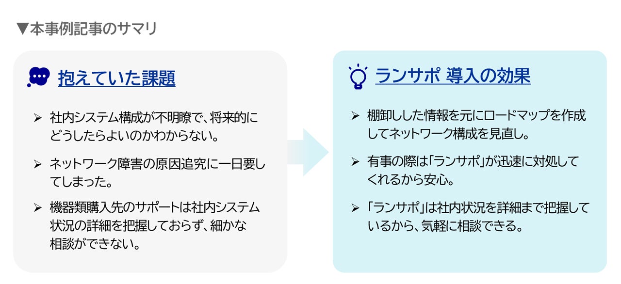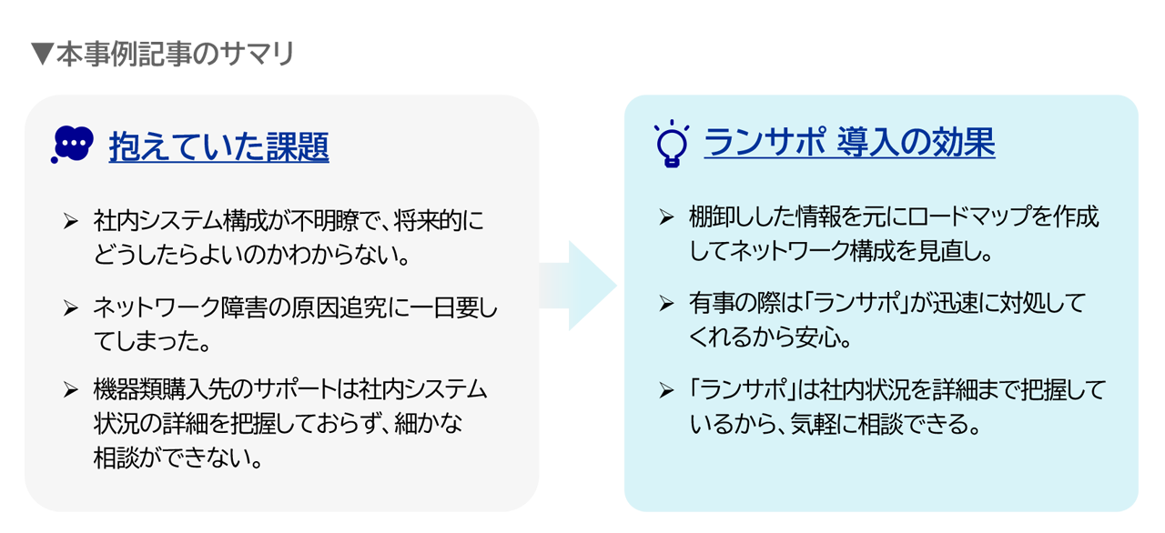 「ランサポ」導入の目的は、同社の企業理念である『「安全」「安心」「信頼」』の提供をネットワーク運用においても実現するためでした。有償トライアルにおいての機器類・ネットワーク構成の棚卸しと、今後の社内システムの方向性についての当社からのご提案により、その品質の高さを実感し、「ランサポ」の効果を確信できたことで導入を決定されたといいます。導入後は、棚卸しした情報をもとに機器類やネットワーク構成をセキュリティの観点から一新し、『「安全」「安心」「信頼」』できるネットワークを構築することができました。