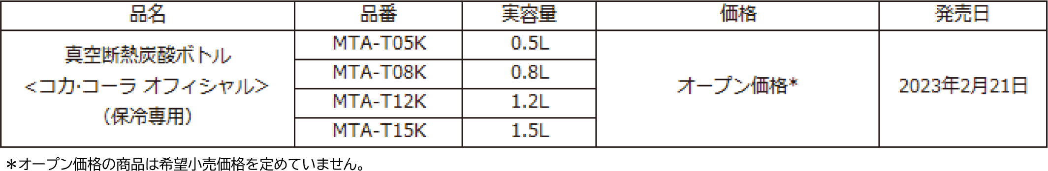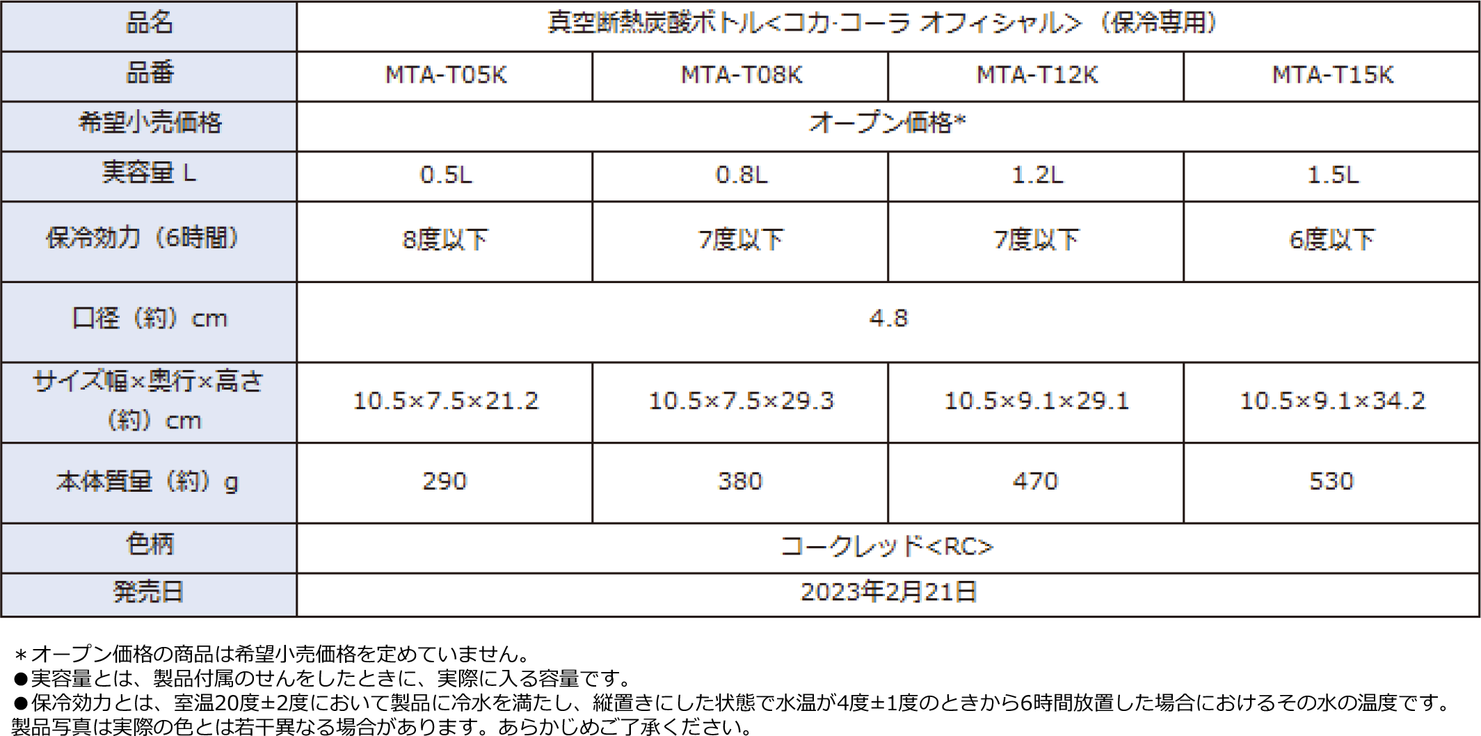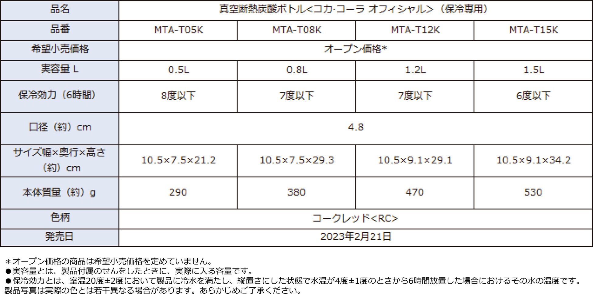 タイガー炭酸ボトルに新たなラインアップが登場!真空断熱炭酸ボトル<コカ·コーラ オフィシャル>(保冷専用) MTA-T05K/T08K/T12K/T15K 2023年2月21日発売