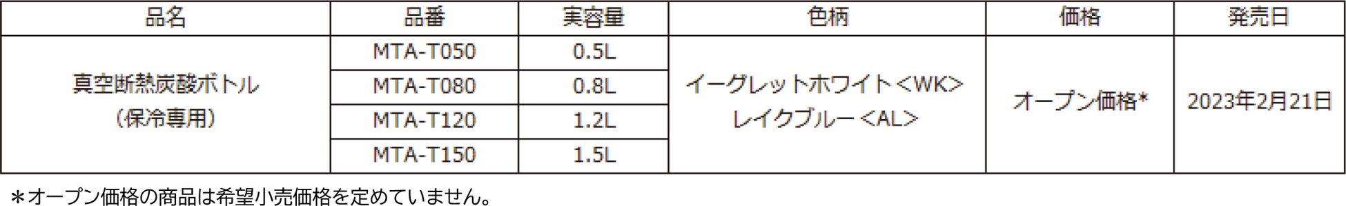 【同日発売】「真空断熱炭酸ボトル MTA-T050/T080/T120/T150」 には2色のカラーが新登場!