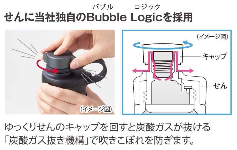 ②炭酸飲料対応せん構造「BubbleLogic(バブルロジック)」を採用した炭酸飲料対応の保冷専用ボトル