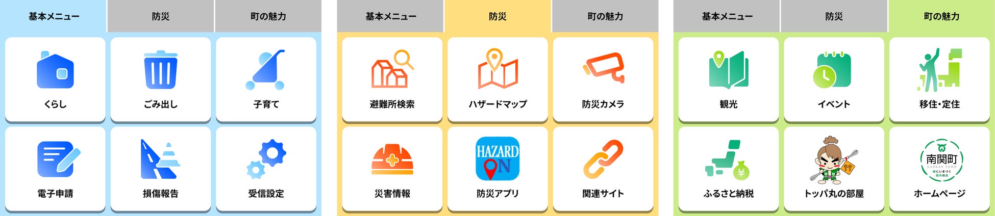 「基本メニュー」「防災」「町の魅力」のメニューから様々な情報を検索することが可能になりました。
