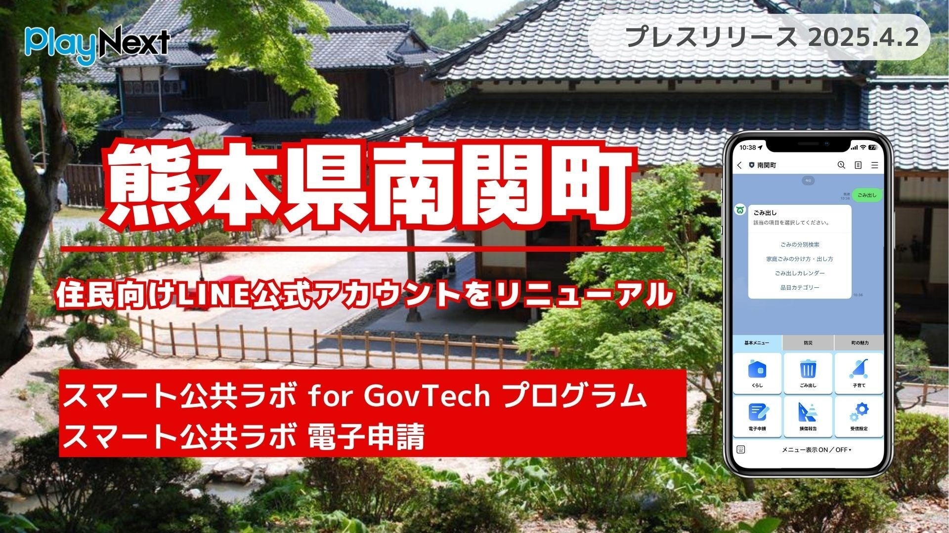 プレイネクストラボ株式会社(本社:東京都品川区、代表取締役:柏 匠、以下 「プレイネクストラボ」)は、熊本県南関町(以下「南関町」)のLINE公式アカウントを「スマート公共ラボ for GovTechプログラム」および「スマート公共ラボ 電子申請」を活用してリニューアルし、2025年4月2日(水)より運用を開始したことをお知らせします。