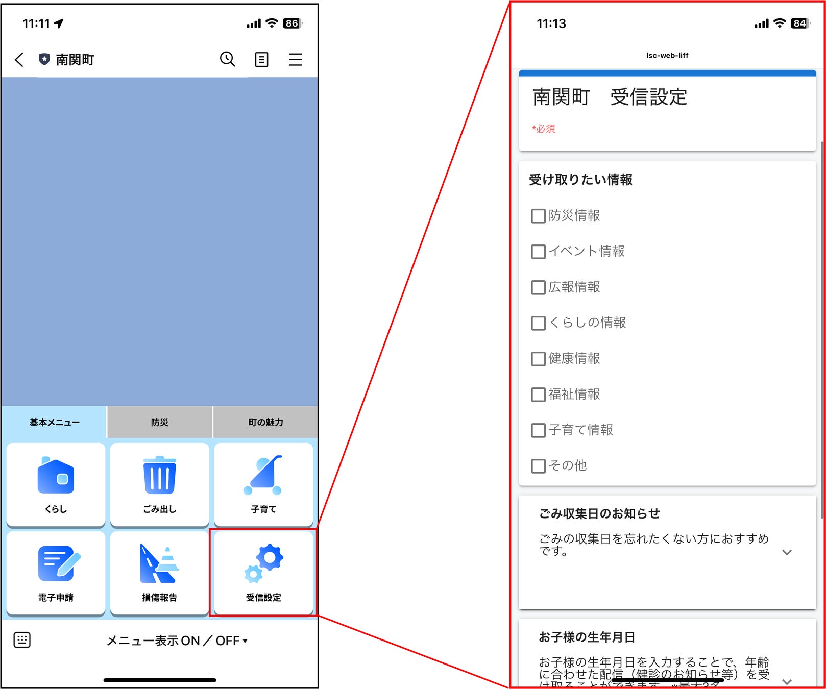 友だち追加をしたユーザーは受信設定に回答することで、受け取る配信の情報カテゴリーをカスタマイズすることができます。あわせて「ごみ収集日のお知らせ」や「お子様の生年月日」に回答することで、登録内容にあわせた情報を効果的に受信することができ、重要な情報を逃しません。