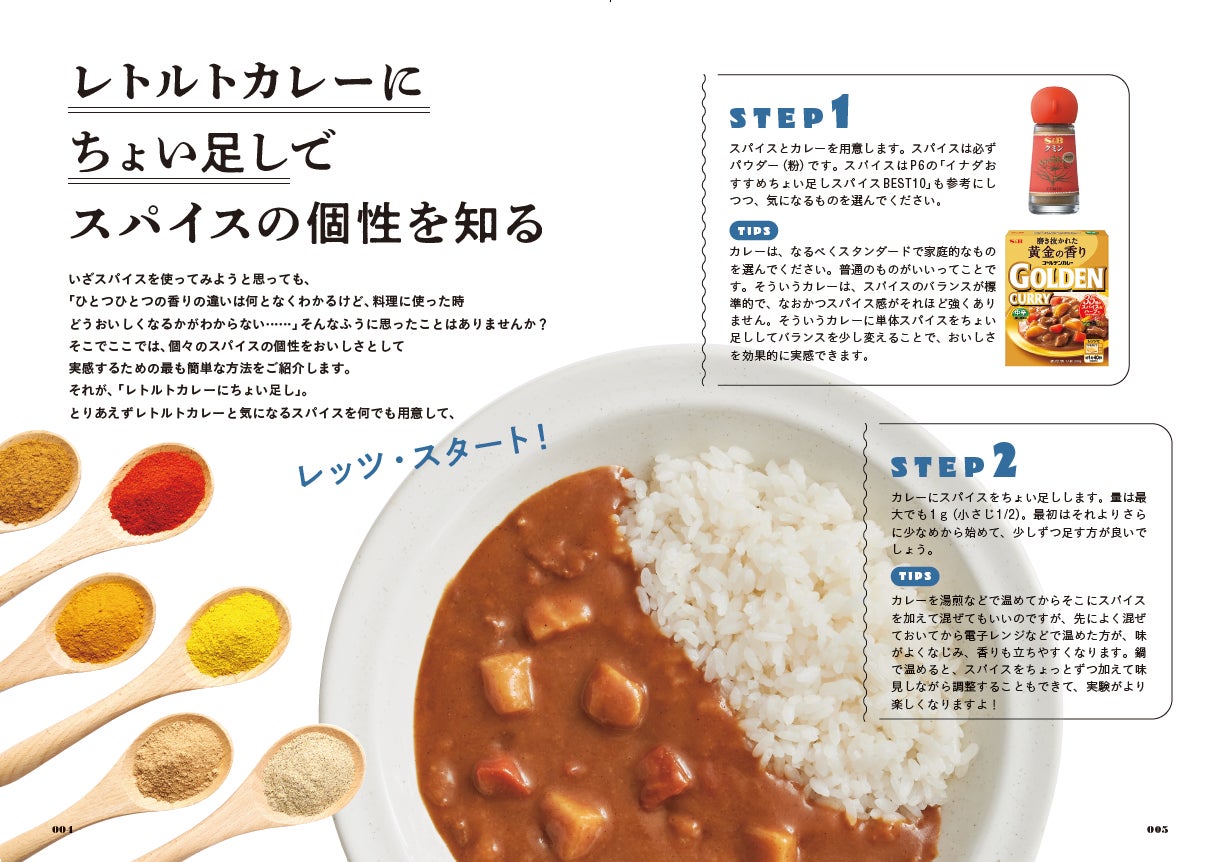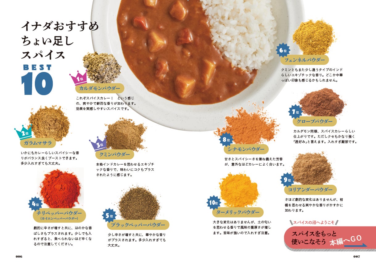 本書の冒頭では、レトルトカレーに気になるスパイスをちょい足しする実験から。個々のスパイスをちょい足しすると味や香りがどう変化するか確かめます。イナダおすすめちょい足しスパイスBEST10は必見!? このページを眺めるだけでもスパイスに興味が湧いてきそう。