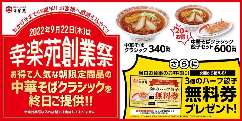 株式会社幸楽苑ホールディングス(本社:福島県郡山市、代表取締役社長:新井田 昇、以下「幸楽苑」) は、2022年9月22日(木)で創業68周年を迎えます。日頃よりご愛顧いただいているお客様への感謝の気持ちを込め、朝限定販売の「中華そばクラシック」を終日ご提供いたします。さらに、当日幸楽苑店舗でお食事いただいたお客様にハーフ餃子の無料券を数量限定でプレゼントいたします。