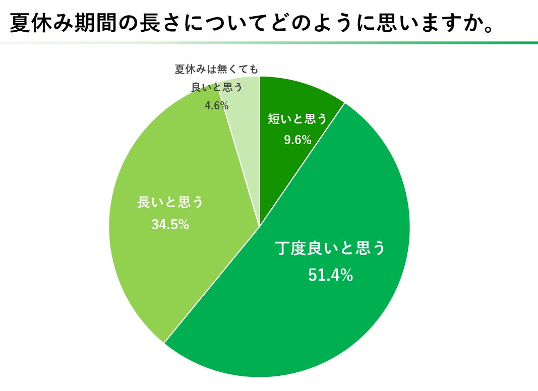 お子さまの夏休みの長さについての設問では、「丁度良いと思う」が51.4%と、2人に1人が適切な長さであると回答。その一方で34.5%が「長いと思う」と回答しており、夏休みの長さに疑問を持つ親もいらっしゃるようです。理由としては下記のような回答が挙げられており、どの回答においても、生活習慣や今年の記録的猛暑を意識している方が多くいらっしゃいました。
