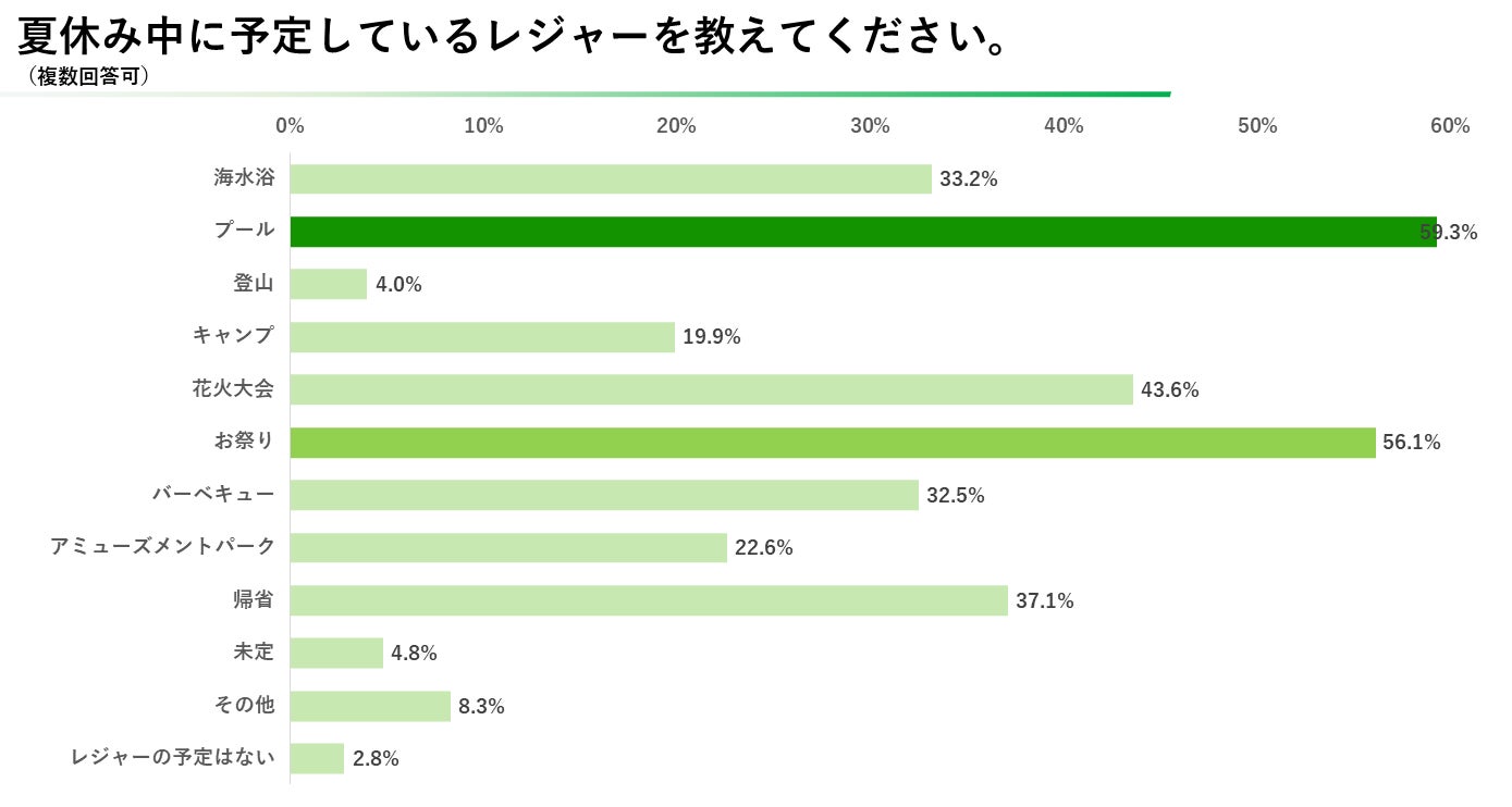 夏休みのレジャー(お出かけ)として人気だったのは「プール」「お祭り」「花火大会」など、夏ならではのイベントが票を集めました。