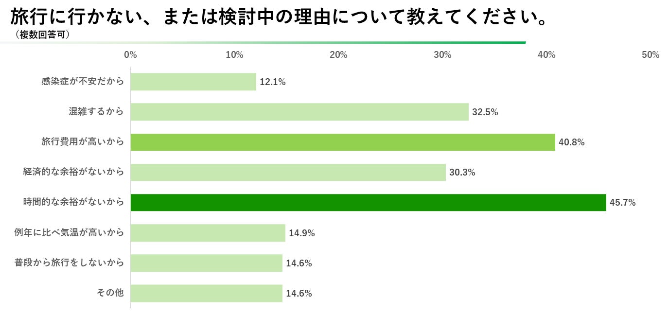 また、旅行に行かない・検討中と回答した方にその理由をお聞きしたところ、「時間的な余裕がない」が45.7%、「旅行費用が高い」が40.8%と多く票を集めました。