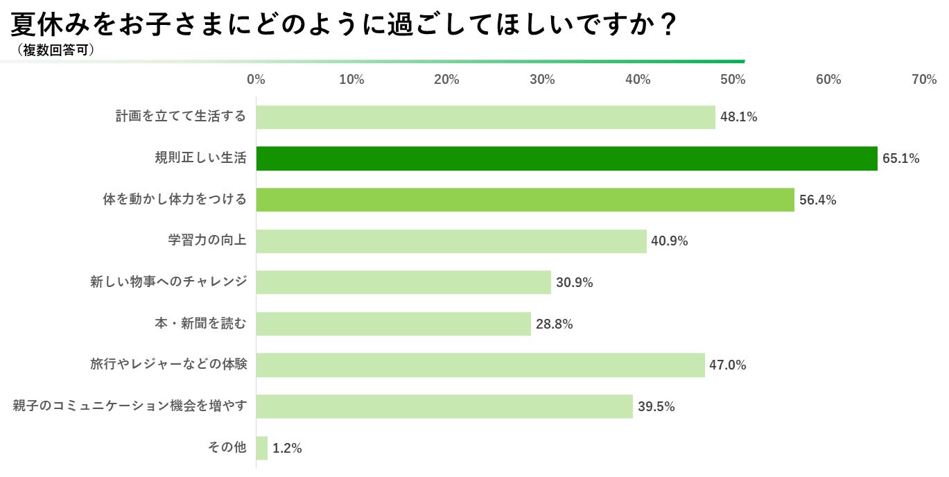 お子様にどのように過ごしてほしいか、という設問では「規則正しい生活」が65.1%と多く票を集めました。夏休みという長期休暇の中で生活リズムを崩さず生活できるかを重視している親が多いようです。それ以外には「体を動かし体力をつける」「計画を立てて生活する」「旅行やレジャーなどの体験」など、長期休暇の貴重な機会に活発で普段できない体験をすることを望む意見に多く票が集まりました。