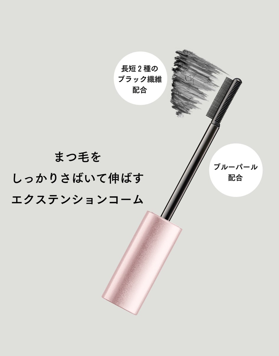 仕上がりの秘密は、長短2種のブラック繊維と、まつ毛をしっかりさばいて伸ばす「エクステンションコーム」。長さだけでなく、まつ毛の本数も増えたような、ふさふさとしたやわらかな仕上がりで、上向きカールを長時間キープします。