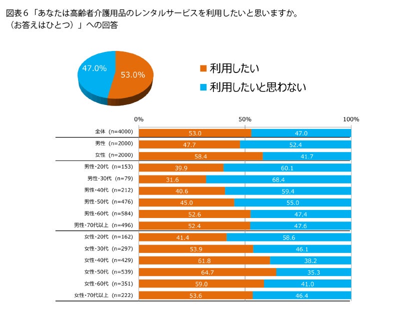 高齢者介護用品のレンタルサービスを利用したいかを聞くと(図表6)、「使用したい」が53.0%、「利用したいと思わない」が47.0%で、ほぼ半々という結果でした。