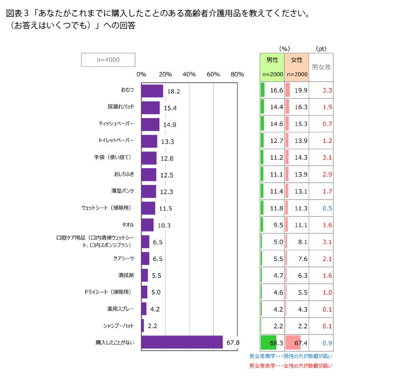 また、「購入したことがない」(67.8%)の割合が、介護経験のない人(76.5%)より低いため、直接の介護経験がなくとも、手伝いなどで購入したことがある人がいるようです。