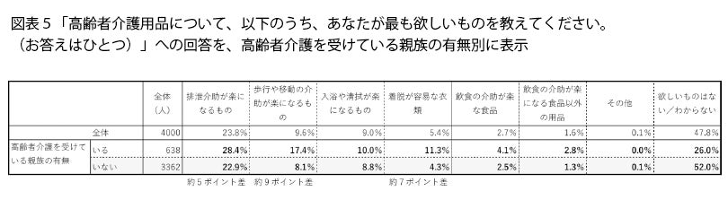 欲しい介護用品について、高齢者介護を受けている親族の有無別に見てみましょう(図表5)。「欲しいものはない/わからない」と回答した人が、「いる」場合、26.0%、「いない」場合は52.0%となっています。