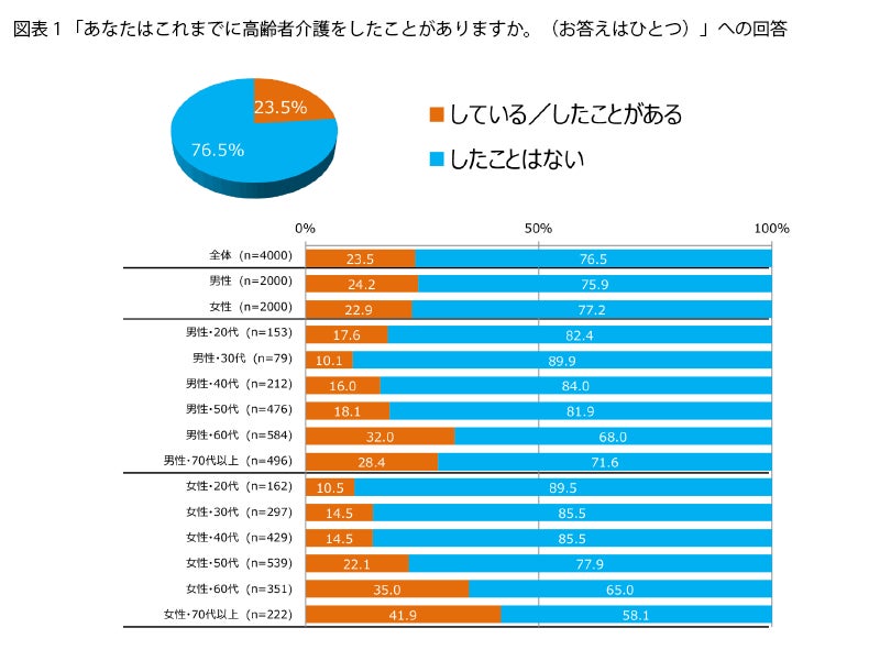 まず、これまでに高齢者介護をしたことがあるかを聞くと(図表1)、「している/したことがある」人が23.5%、「したことはない」人が76.5%でした。2022年調査(図表不掲載)では、「1人だけ」したことがある人が15.3%、「2人以上」したことがある人が5.1%、「したことはない」人が79.7%でしたので、介護経験がある人の割合が少しだけ上がっています。