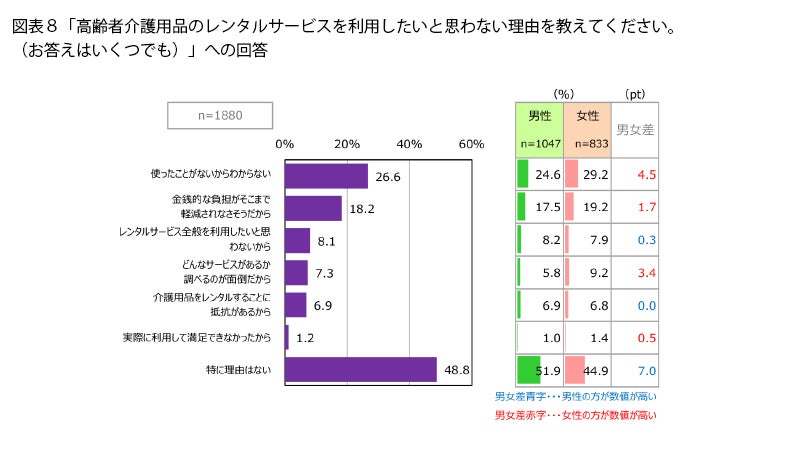 一方、利用したいと思わない理由は、「使ったことがないからわからない」(26.6%)、「金銭的な負担がそこまで軽減されなさそうだから」(18.2%)、「レンタルサービス全般を利用したいと思わないから」(8.1%)、「どんなサービスがあるか調べるのが面倒だから」(7.3%)という順番です。