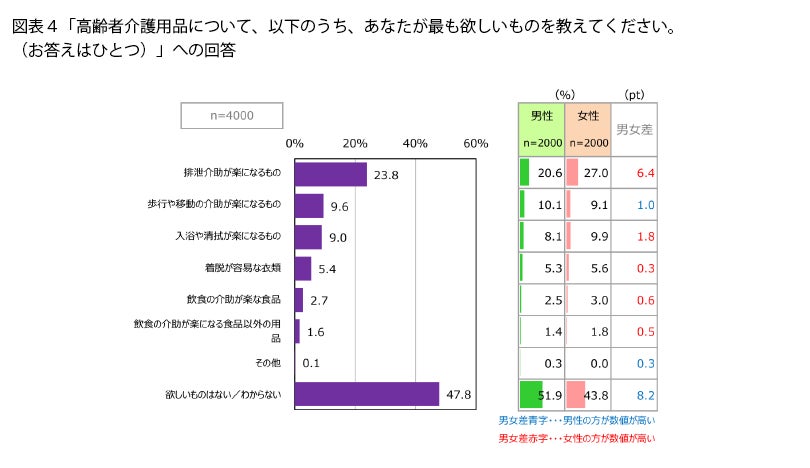高齢者介護用品について、どんなものが欲しいかを聞くと(図表4)、最も割合が高かったのは「排泄介助が楽になるもの」(23.8%)でした。2位以下の「歩行や移動の介助が楽になるもの」(9.6%)や「入浴や清拭(せいしき)が楽になるもの」(9.0%)と比べると、かなりの差がついています。