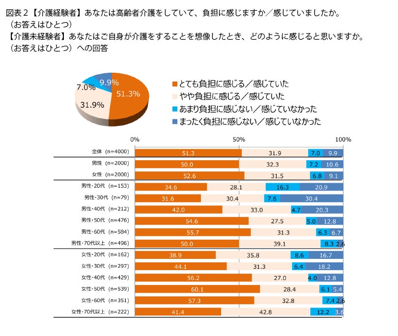 そして、高齢者介護を負担に感じるか(感じると思うか)を聞くと(図表2)、「とても負担に感じる/感じていた」が51.3%、「やや負担に感じる/感じていた」が31.9%でした。「とても負担に感じる/感じていた」人の割合は、男女ともに「70代以上」よりも下の世代のほうが高くなっており、これは2022年の調査でも同様の傾向でした。