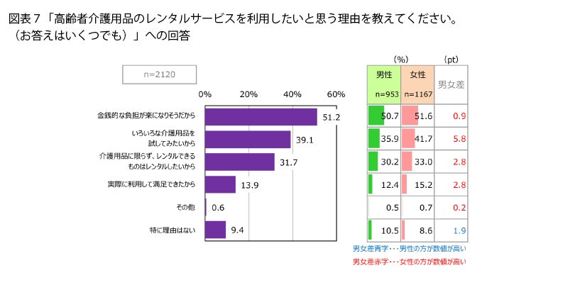 利用したいと思う理由は、「金銭的な負担が楽になりそうだから」(51.2%)、「いろいろな介護用品を試してみたいから」(39.1%)、「介護用品に限らず、レンタルできるものはレンタルしたいから」(31.7%)、「実際に利用して満足できたから」(13.9%)という順になりました。