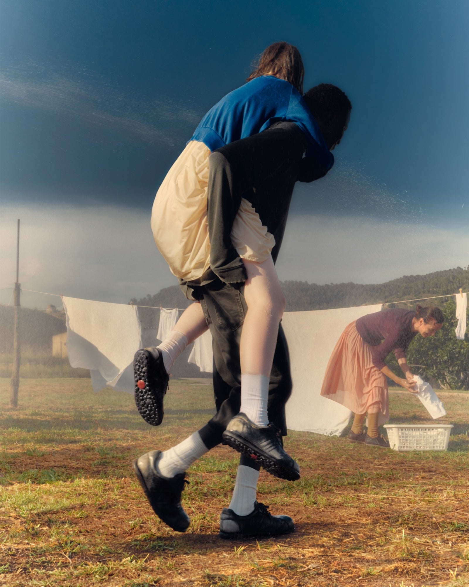 今シーズンのPelotas Arielは、カンペールのアーカイブから90年代のデザインを復活させ、ハンドブラッシュ仕上げとボクシングシューズにインスパイアされたスタイルが登場。そんなPelotasにフォーカスした新しいキャンペーンは、ドキュメンタリーのような雰囲気で親密な家族のポートレートを撮影することで知られている、マドリッドとバスク地方を拠点に活動するスペイン人写真家、Aitor Laspiur(アイトール・ラスピウール)が撮影。バルセロナ郊外のモンセラット近郊で撮影されたこのキャンペーンは、無邪気な十代の子供たちが自転車に乗り、芝生の上を転がり、雨を楽しむ様子を映し、日常靴としての Pelotas の世代を超えた愛に焦点を当て、スペイン文化における「ストリート・通り(la calle)」の重要性を探求しています。