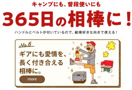 10,000円(税込)以上お買い上げのお客様に“365相棒ティッシュケース”を合計10,000名様にプレゼントします。ハンドルとベルトがついているので縦横好きな向きで使えるのでテーブルの脚に着ければスッキリして“スぺパ”のよいアイテムです。キャンプ中はもちろんのこと、車の中など普段使いで365日の相棒にしてください。