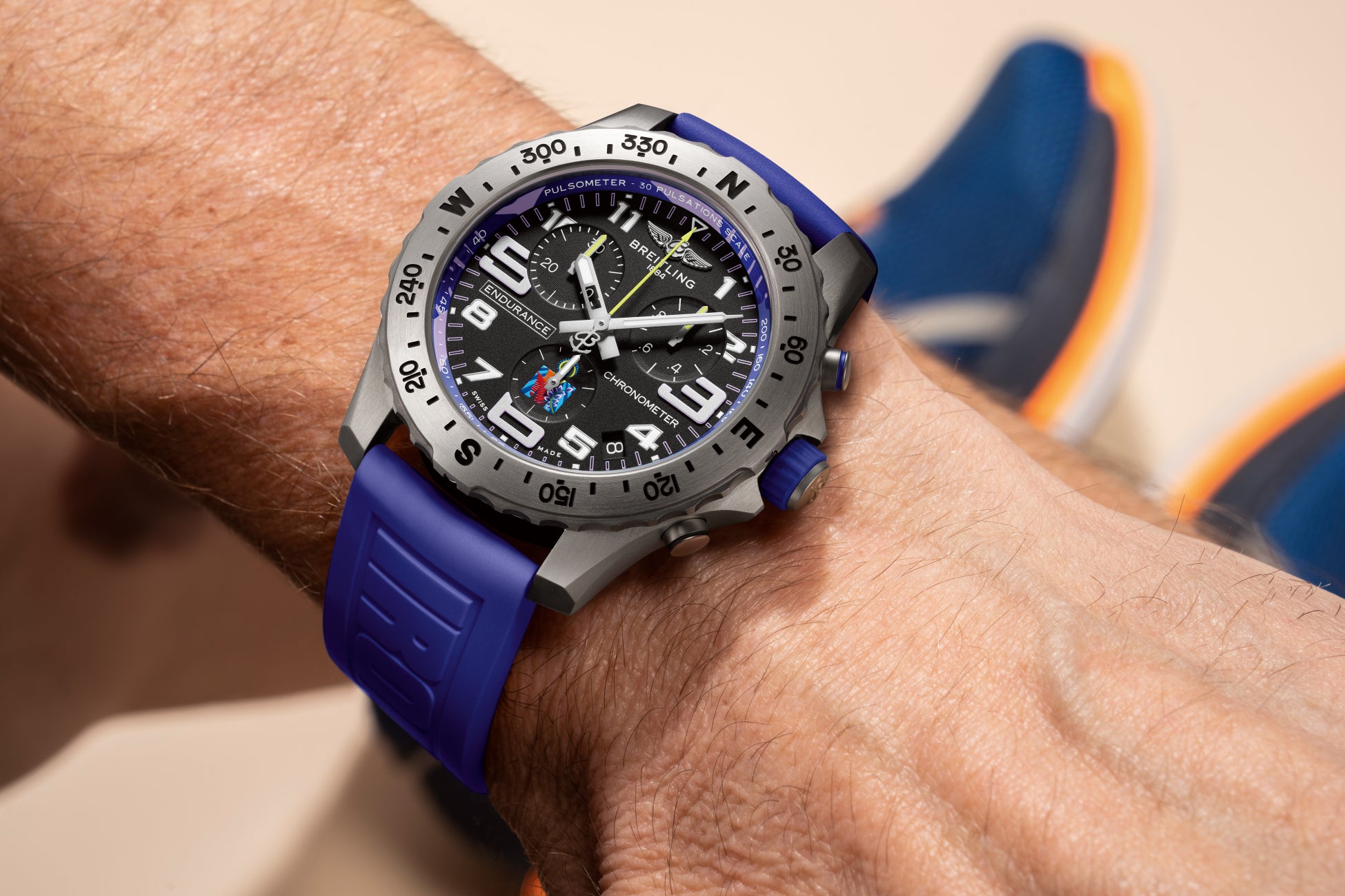 ブライトリングの超軽量Endurance Proは、ステンレススチールの約2.2倍の軽さと堅牢さを誇る素材であるチタン製で、トライアスロンアスリートを念頭にデザインされています。同時にスタイリッシュでスポーティなクロノグラフであり、普段使いにも最適です。
