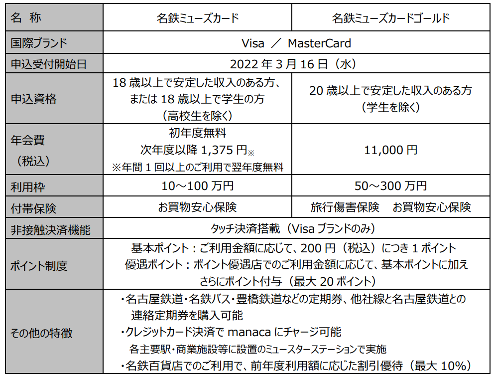 名古屋鉄道株式会社(本社:愛知県名古屋市、社長:髙﨑 裕樹、以下「名古屋鉄道」)と三井住友カード株式会社(本社:東京都江東区、社長:大西 幸彦、以下「三井住友カード」)は、2022年3月16日(水)、名古屋鉄道グループでのご利用でミュースターポイントがおトクにたまるクレジットカード「名鉄ミューズカード」を発行開始します。また、カードの発行を記念して、新規入会キャンペーンを実施します。