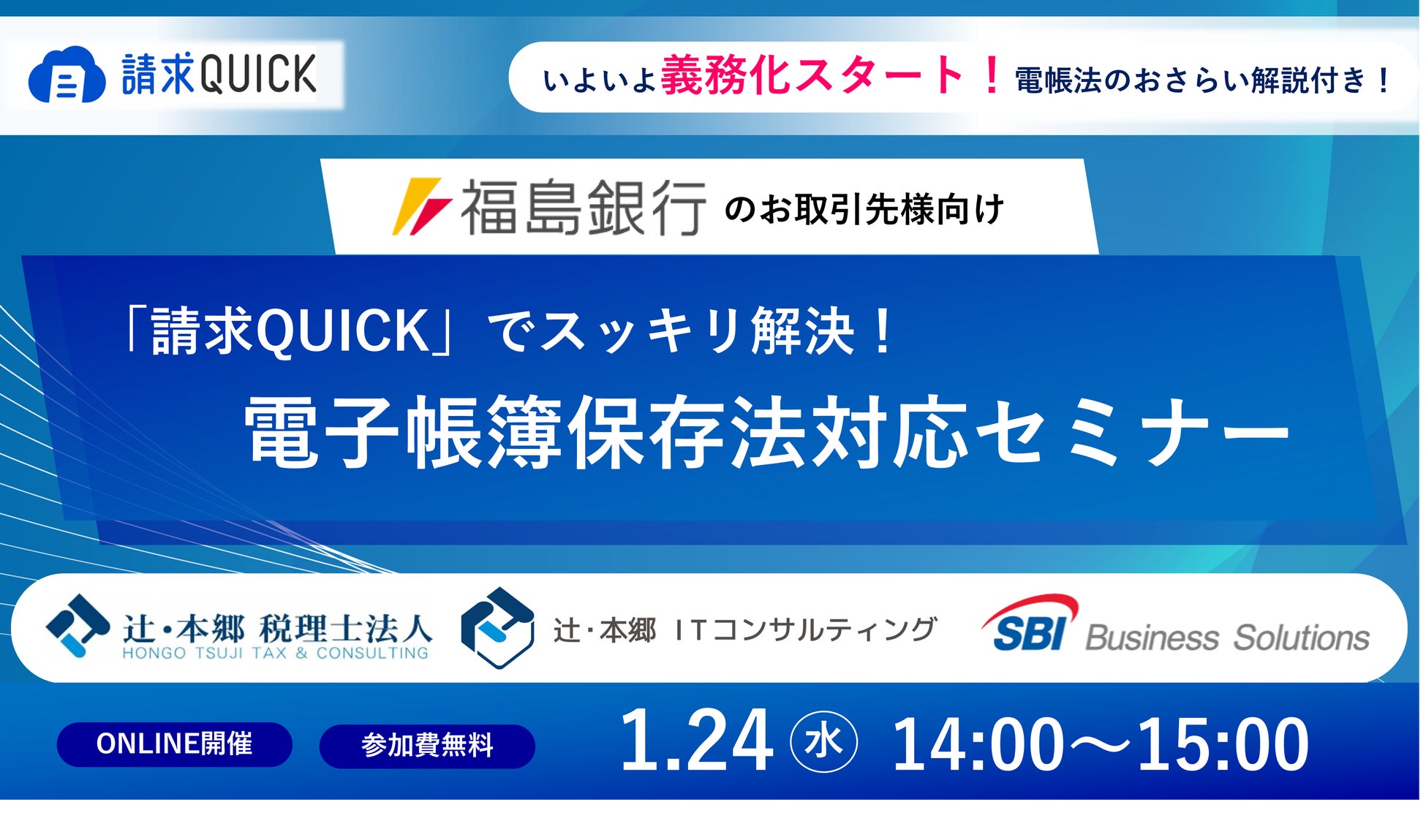 総合フィンテックソリューション企業であるSBI FinTech Solutions株式会社の子会社で、バックオフィス支援サービスを提供するSBIビジネス・ソリューションズ株式会社(本社:東京都港区、代表取締役社長:夏川 雅貴、以下「当社」)は、辻・本郷 税理士法人(本社:東京都新宿区、理事長:徳田 孝司)および、辻・本郷 ITコンサルティング株式会社(本社:東京都渋谷区、代表取締役:黒仁田 健、以下「辻・本郷グループ」)とともに、株式会社福島銀行(本店:福島県福島市、取締役社長:加藤 容啓、以下「福島銀行」)のお取引先様向けに開催される、「電子帳簿保存法対応セミナー」に登壇しますので、お知らせいたします。
