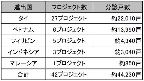 上記6つのプロジェクトにより、当社のタイにおける住宅分譲事業は27プロジェクト(約22,010戸)となり、また海外における住宅分譲事業全体では42プロジェクト(約44,230戸)となります。