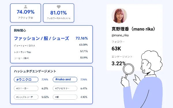 加えて、フォロワーをお金で購入できてしまう時代に対応するため、独自AIが「意味のあるフォロワー」の割合を算出。約200万アカウントを対象とした業界最大級のデータベースを活用し、「映える」ではなく「売上につながる」インフルエンサーを科学的に見極めることを可能にしています。