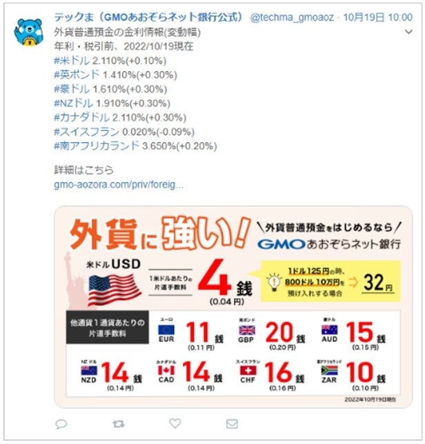 最新の外貨普通預金金利や外貨商品に関する情報を、公式Twitter「テックま(@techma_gmoaoz)」でお知らせしています。