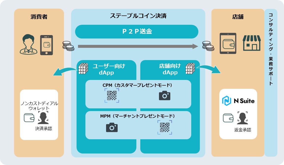 ブロックチェーン技術を活用し、店舗は消費者から直接ステーブルコインを受取可能。店舗はスマートフォンやタブレットがあれば専用の決済端末は不要であり、導入にあたっては、暗号資産交換所等への口座開設からアプリケーション導入までをサポート予定。
