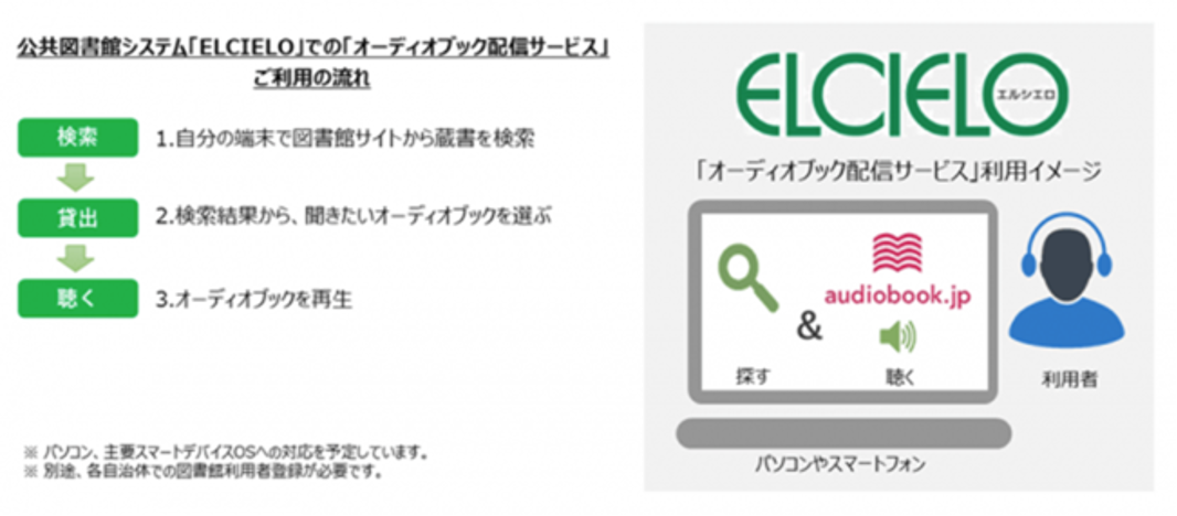 「オーディオブック配信サービス」 は、KCCSの公共図書館システム「ELCIELO」と株式会社オトバンクが提供する「audiobook.jp」が連携した「ELCIELO」のオプションサービスです。障害者差別解消法および読書バリアフリー法への対応の一つ、そして本を耳で楽しめるサービスを提供しています。
