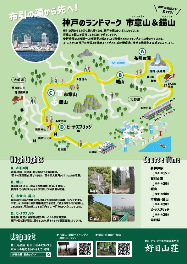 登山・アウトドア・クライミング用品総合専門店、クライミングジムを運営する株式会社好日山荘(本社:兵庫県神戸市、代表取締役社長 池田 真吾)は、8月25日(木)~10月31日(月)まで、JR西日本と共同で神戸市にある新神戸駅から近い布引の滝を中心とした六甲山エリアでのハイキングの魅力をディスプレイにより発信いたします。