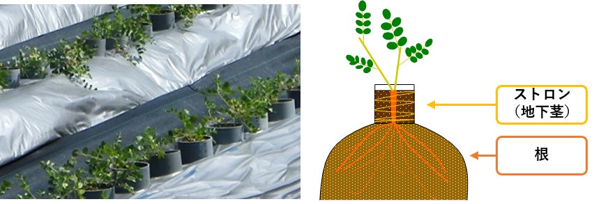 生薬として用いられる“根”を肥大化させるため、ストロン(地下茎)の成長を抑制する「ストロン抑制短筒栽培法」を採用。「ストロン抑制短筒栽培法」は当社が開発したカンゾウ属植物の栽培方法であり、2014年に特許(特許第5635714号)を取得しています。