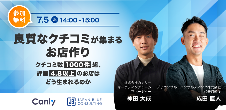 【店舗集客に携わっている方向け】「良質なクチコミが集まるお店作り〜クチコミ数1000件超、評価4.8以上のお店はどう生まれるのか〜」ウェビナーを7/5に開催決定!