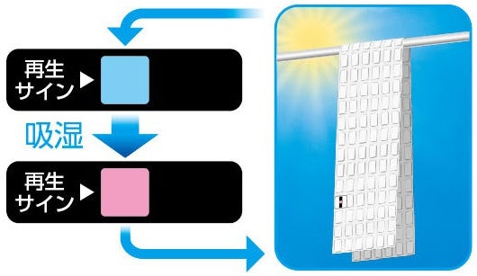 今回発売する『ドライ&ドライUP ふとんW除湿シート』は、ふとんの下に敷くだけで、寝汗による湿気をたっぷり吸収できる除湿剤です。ふとんからはみ出る長さ215cmのロングシートが、ふとんの下に空気の通り道を作る、湿気がこもりにくい通気構造です。加えて、汗や体臭などの気になるニオイを消臭します。また、シートは天日に干してくり返し使えて、湿気を吸うと色が変わって干すタイミングを知らせる“再生サイン”付きです。