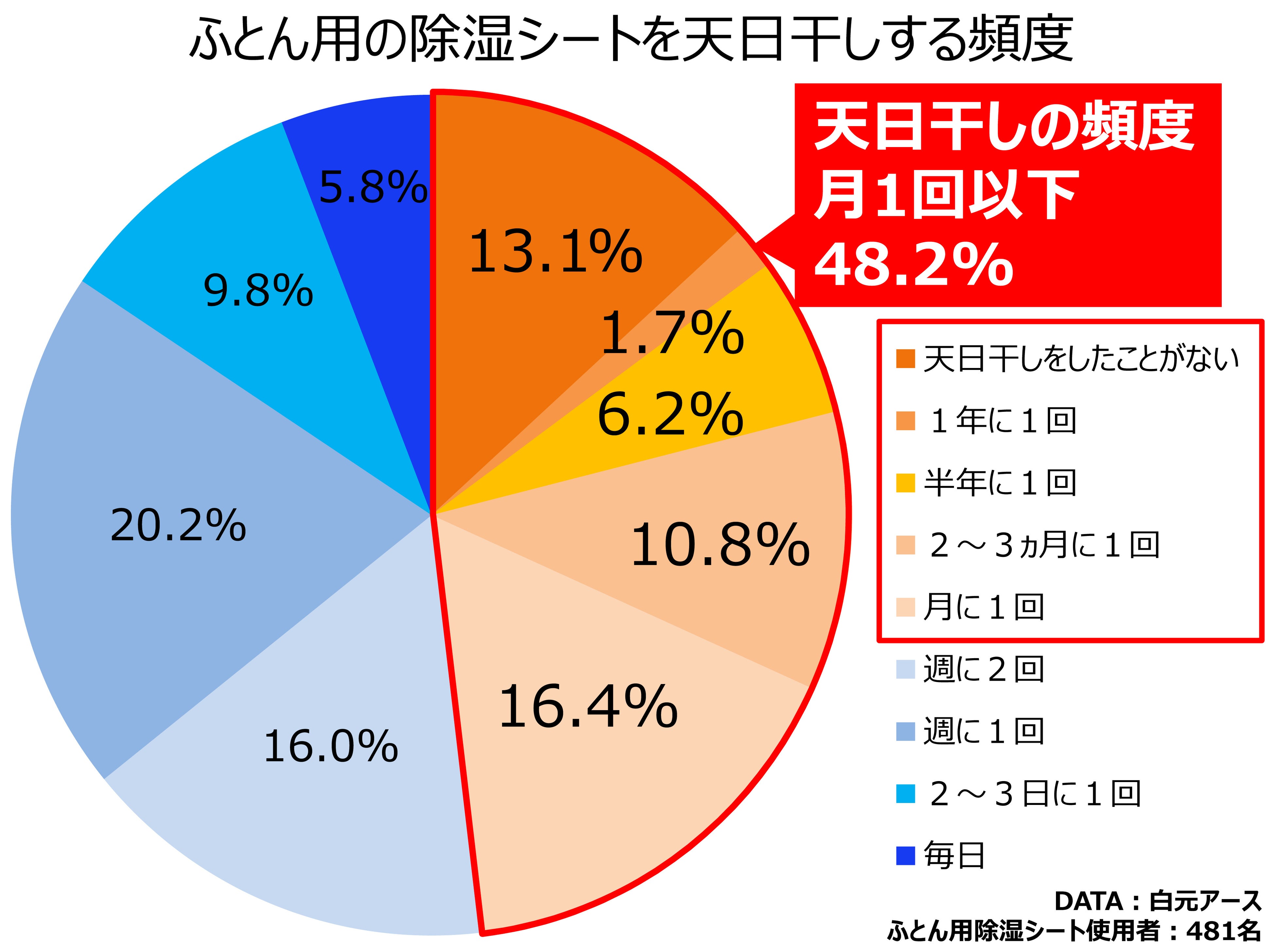 当社がふとん用除湿シートユーザーに“天日干しの頻度”について調査したところ、半数近い方が月1回以下であり、湿気がこもりやすい使用環境であることが分かりました(下図参照)。