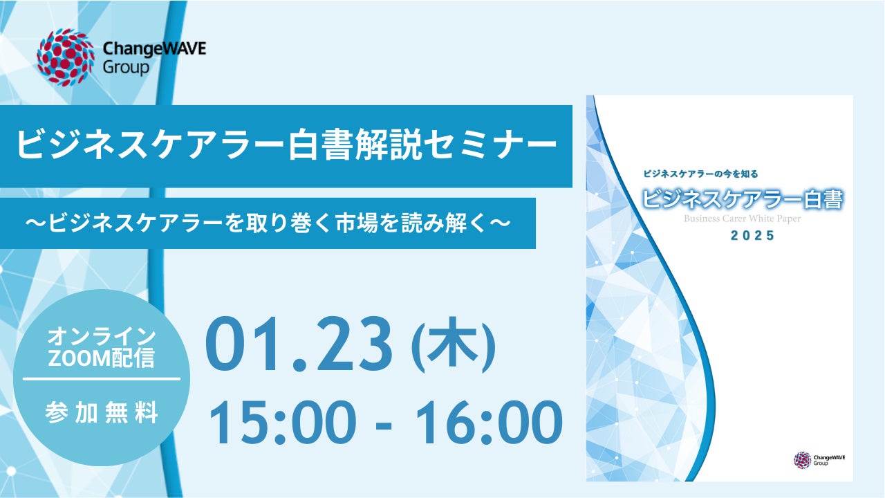 仕事と介護の両立支援を行う株式会社チェンジウェーブグループ(本社:東京都港区、代表取締役社長:佐々木裕子)は、12月に発刊した『ビジネスケアラー白書2025』ベースに市場とビジネスケアラーの実態を解説する「ビジネスケアラー白書解説セミナー」を1月23日(木)に開催します。