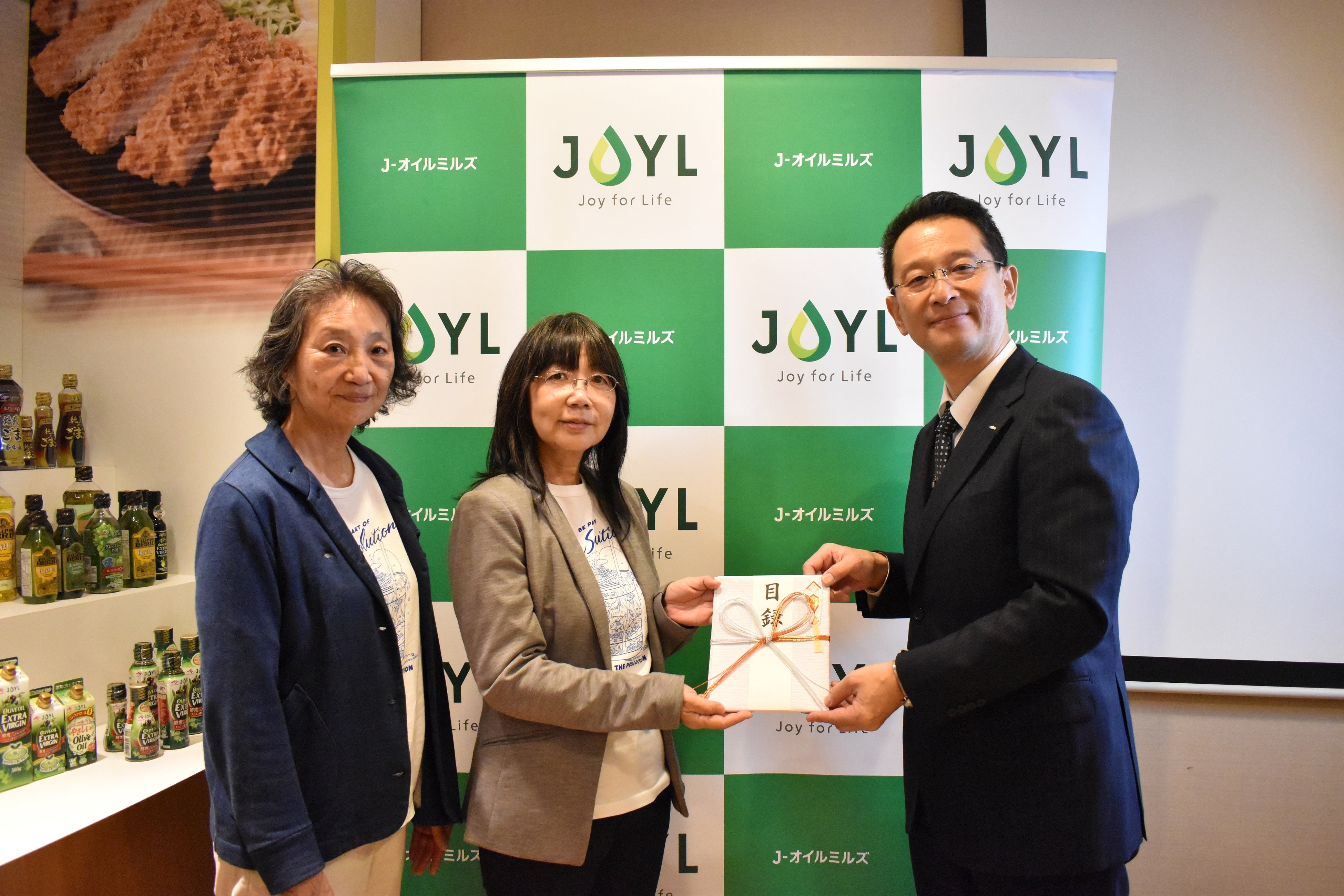 JEAN 小島あずさ 氏(左)、同 吉野美子 氏(中央)、当社執行役員 営業戦略担当 兼 マーケティング担当 古川光有(右)=10月23日、寄付金の贈呈式を開催