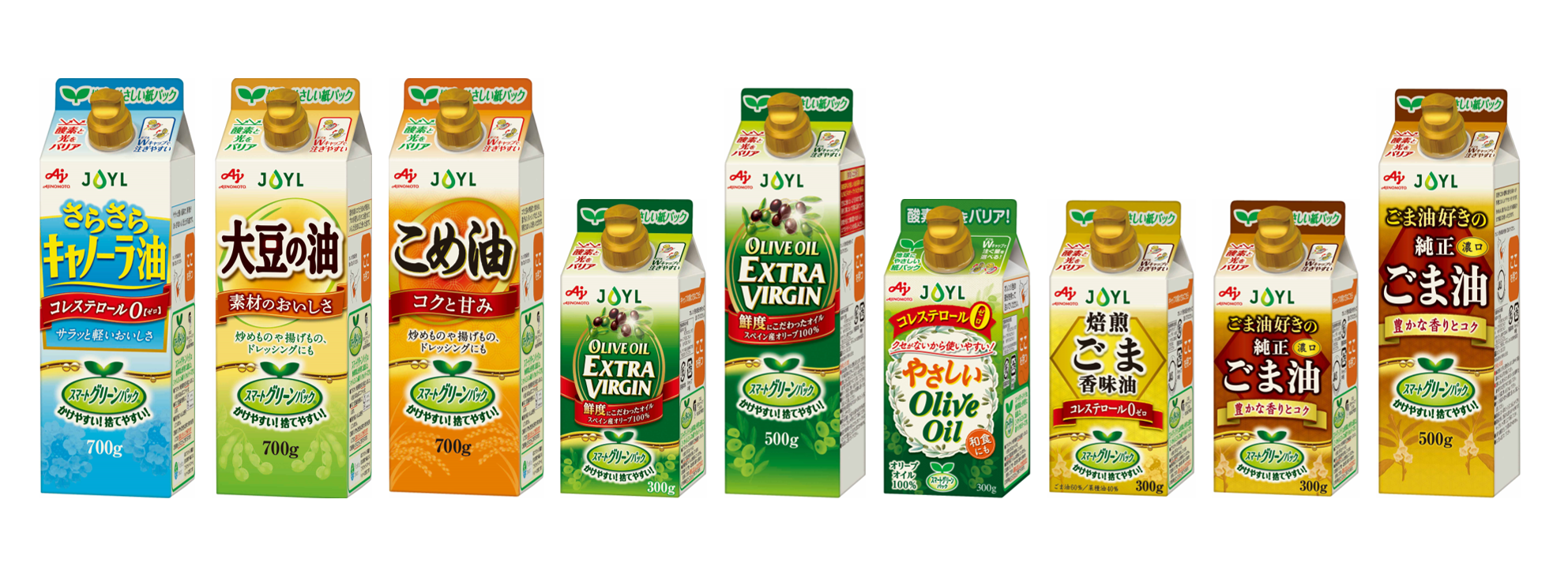 「スマートグリーンパック®」シリーズは、プラスチック廃棄物やCO2の削減を推し進めるため、油脂製品では珍しい紙パック(森林認証紙)を容器に採用し、包装機能と環境対応を追求したシリーズです。2021年8月に2製品を販売開始後、2022年春にシリーズ化、その後もラインナップの充実を図っています。