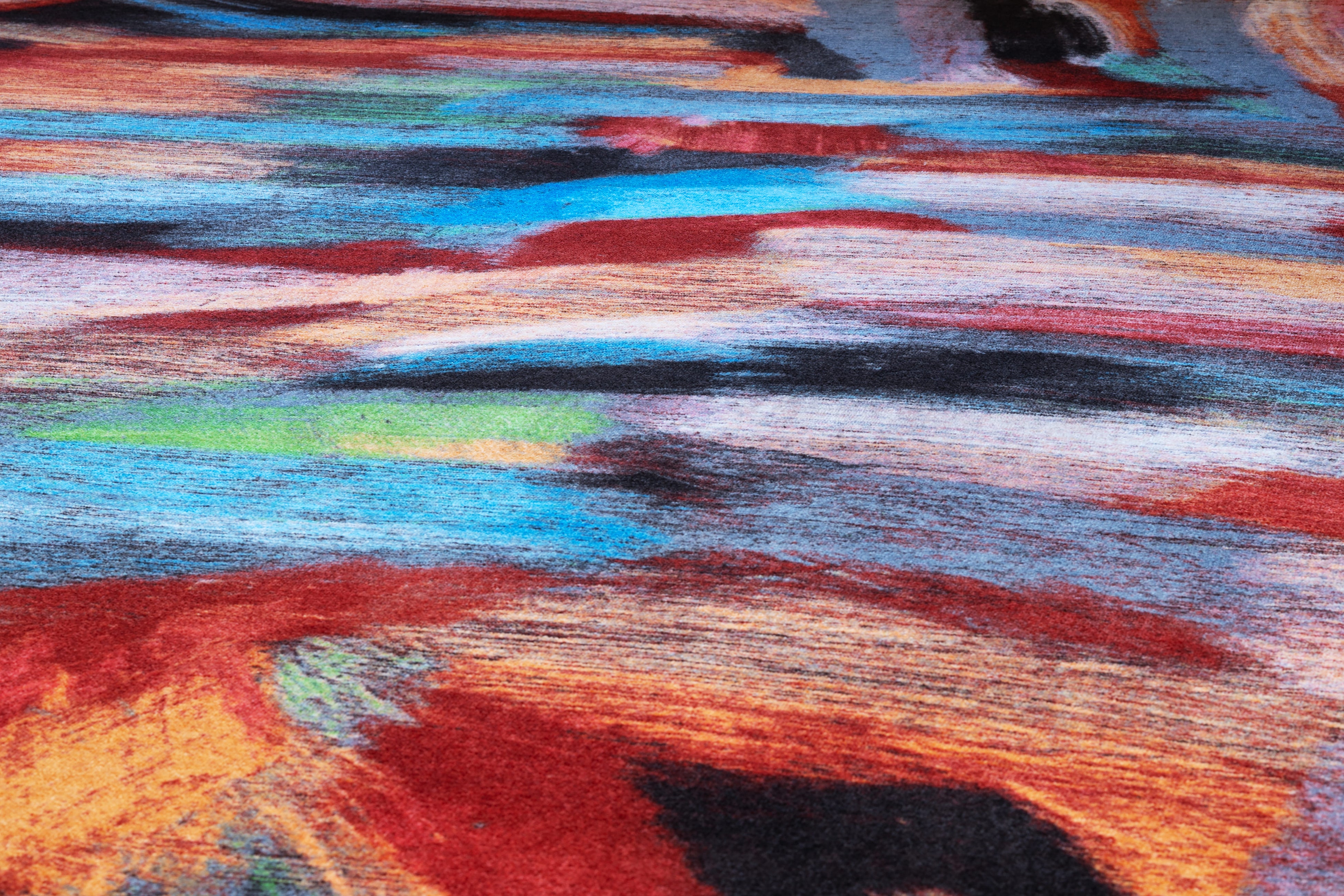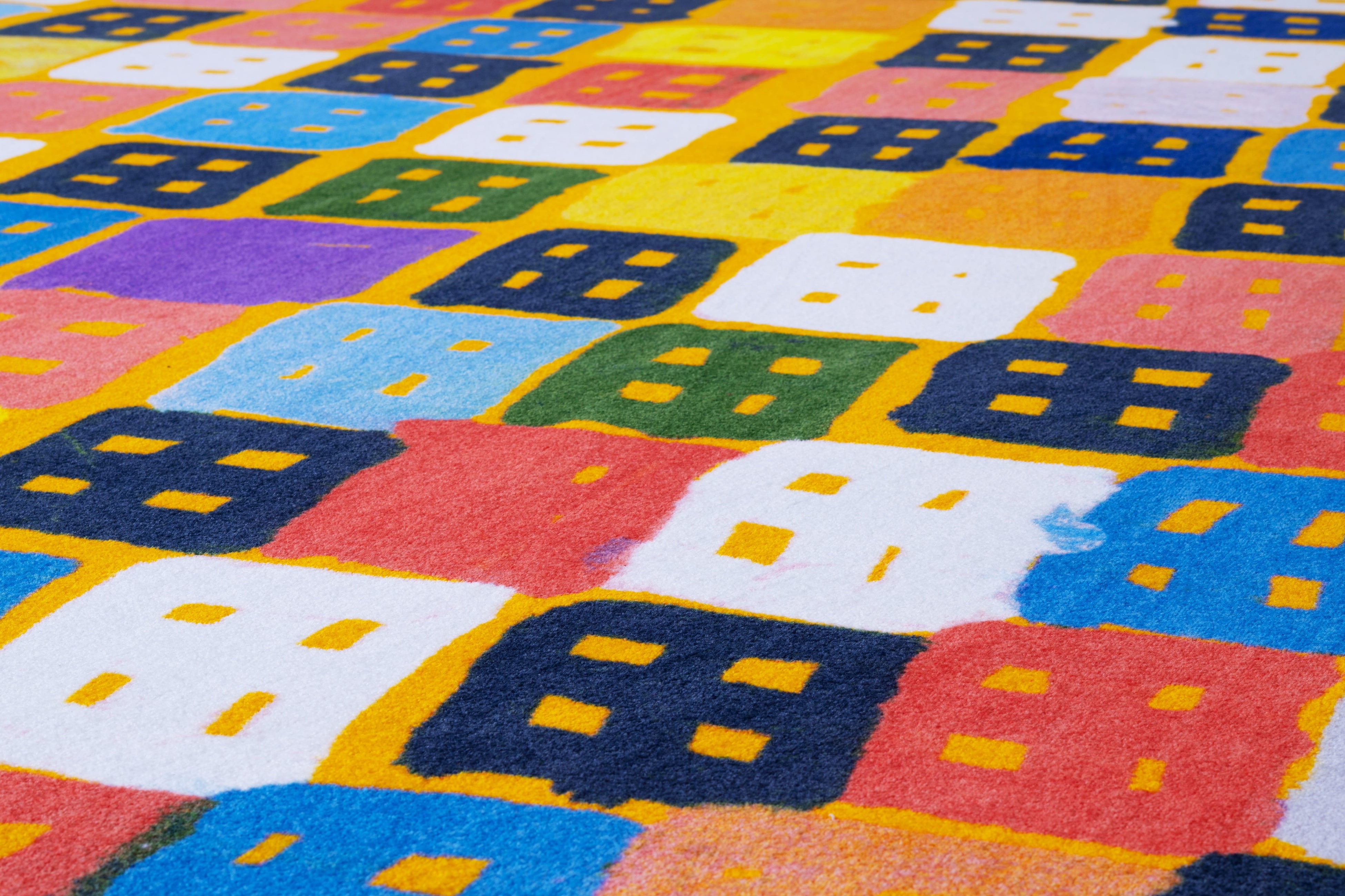 写真:ヘラルボニーの契約作家・渡邊 昌貴氏(多夢多夢中山工房)の作品「ビル」をコモンホールのカーペットに起用
