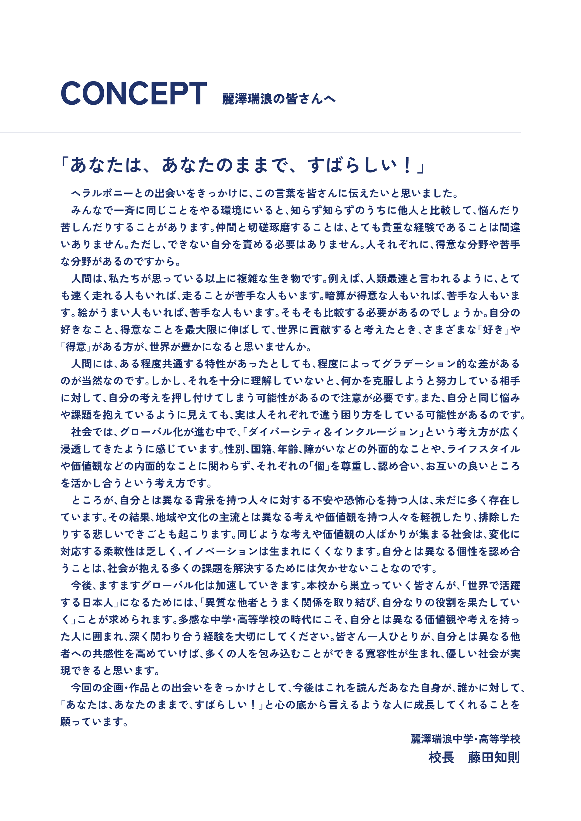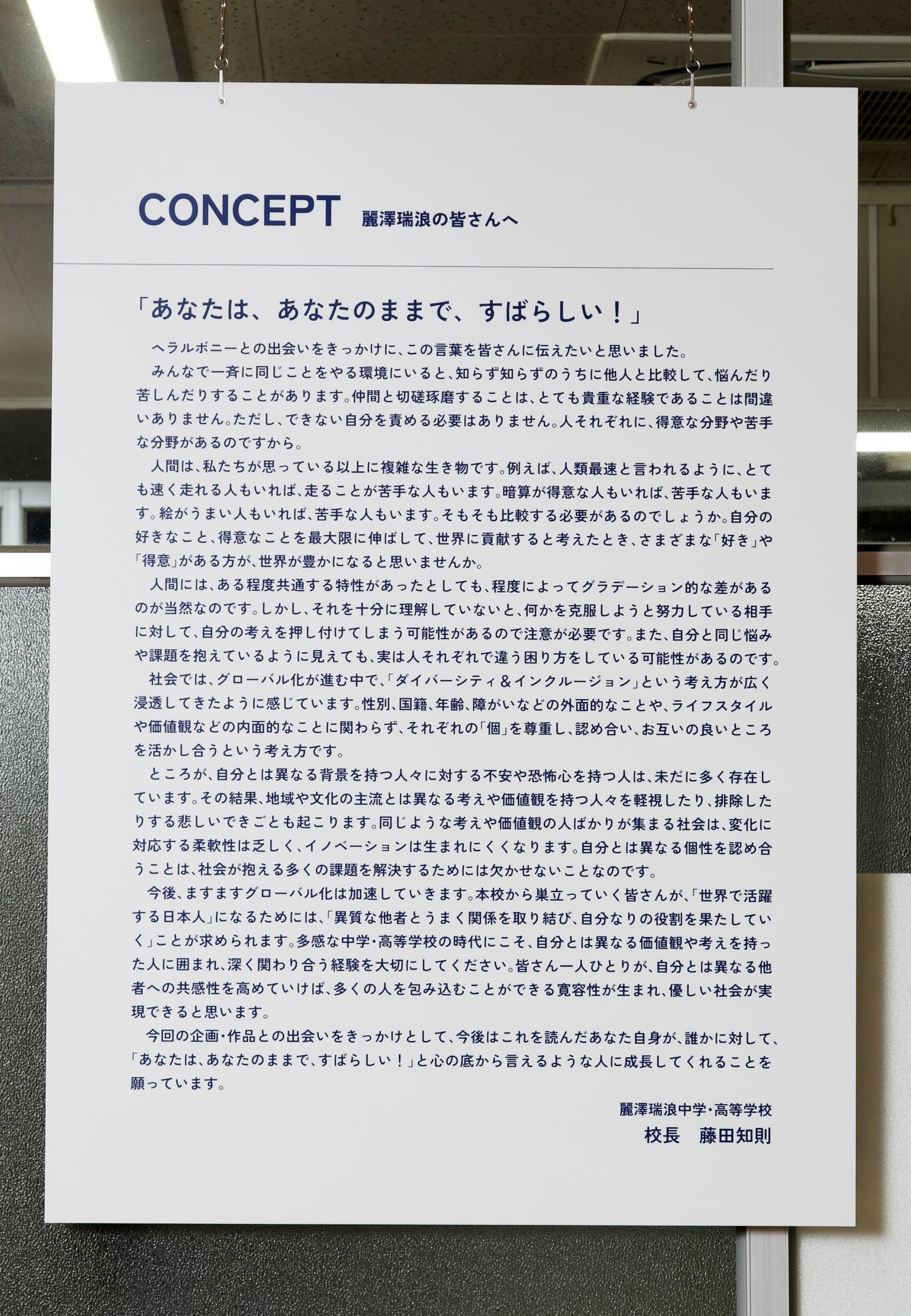 株式会社ヘラルボニー(本社:岩手県盛岡市、代表取締役社長:松田 崇弥 代表取締役副社長:松田文登、「異彩を、放て。」をミッションに、障害のある作家のアートをさまざまな形で社会に届け「障害」のイメージ変容と新たな文化創造を目指す福祉実験ユニット、以下、ヘラルボニー)と 長谷虎紡績株式会社(本社:岐阜県羽島市、代表取締役社長:長谷 享治、創業明治20年、社会の変化に順応しつつ、どこにも真似のできないオリジナリティを追求する繊維メーカー、以下、長谷虎紡績)、麗澤瑞浪中学・高等学校 (岐阜県瑞浪市、校長:藤田 知則)は、企業2社1校共同で 「ダイバーシティ&インクルージョン」の教育推進を目的としたイベント「あなたは、あなたのままで、すばらしい!」を開催します。