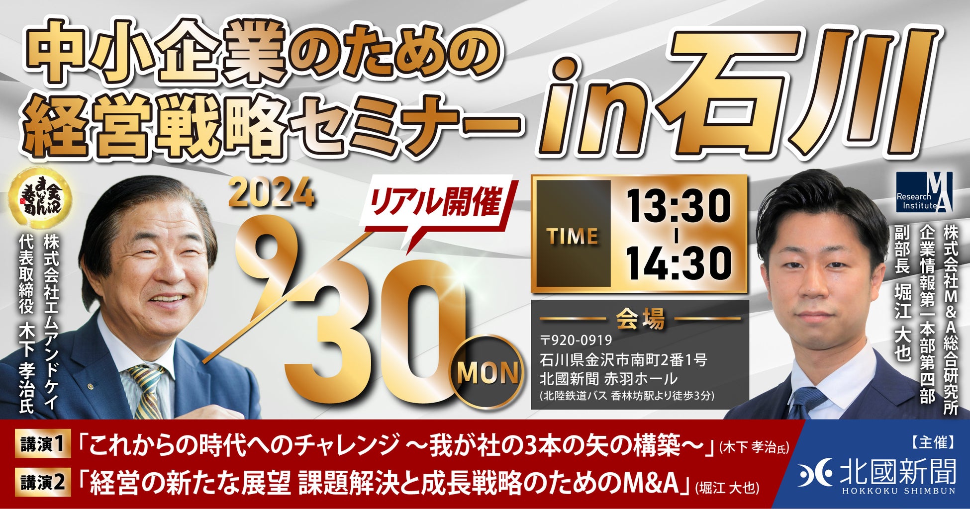 株式会社M&A総合研究所(本社:東京都千代田区、代表取締役社長:佐上 峻作、以下「当社」)は、2024年9月30日(月)に石川県金沢市でM&A・事業承継に関するセミナーを実施いたします。